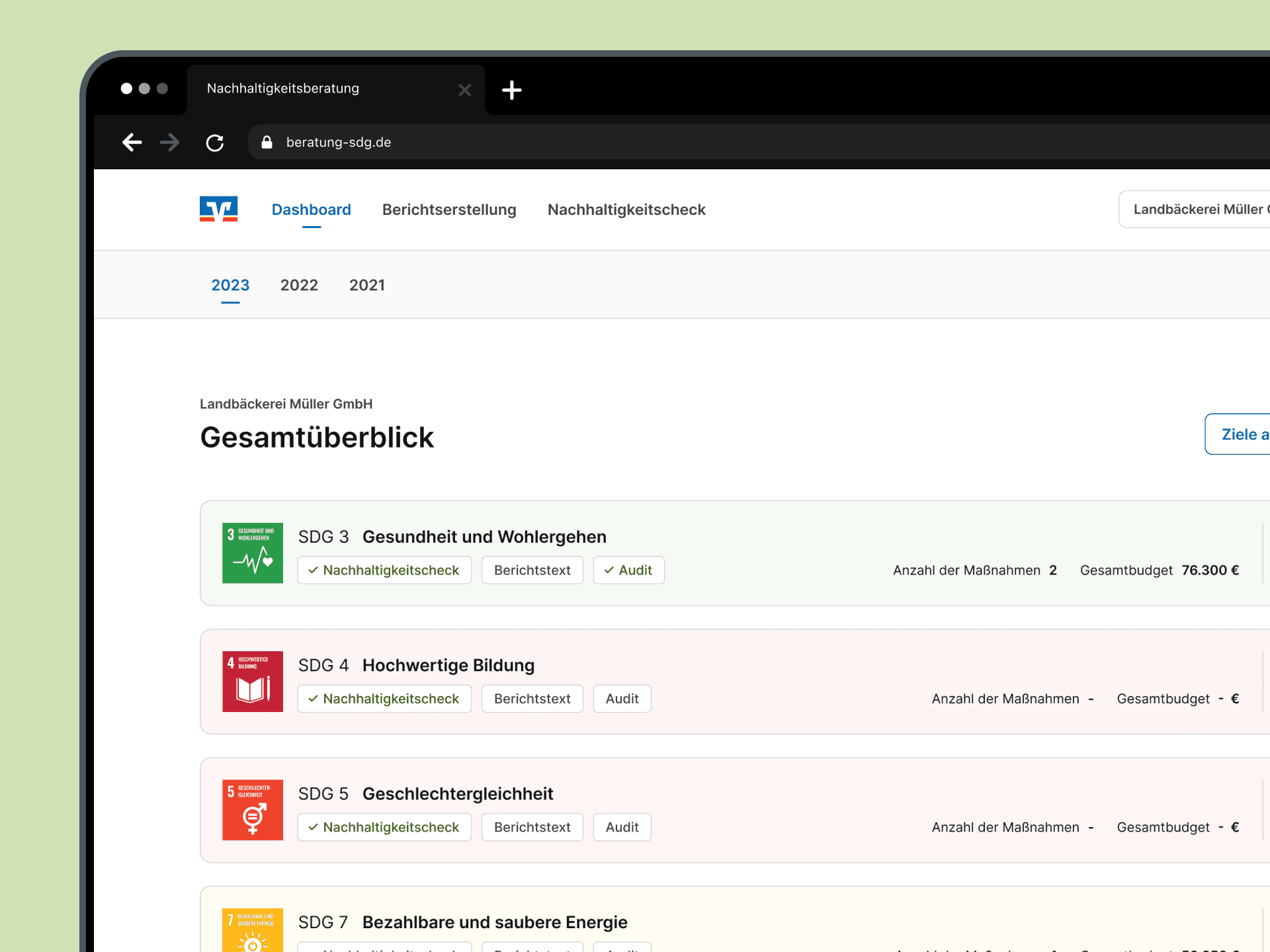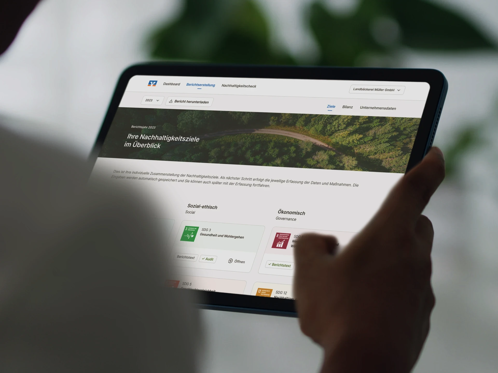 Mit unserer Begleittechnologie wird die Nachhaltigkeitsberatung von Firmenkunden intuitiv und skalierbar. Ziele setzen, Strategien und Maßnahmen entwickeln, Bilanz ziehen, und einen Bericht erstellen. Einfach nachhaltig.